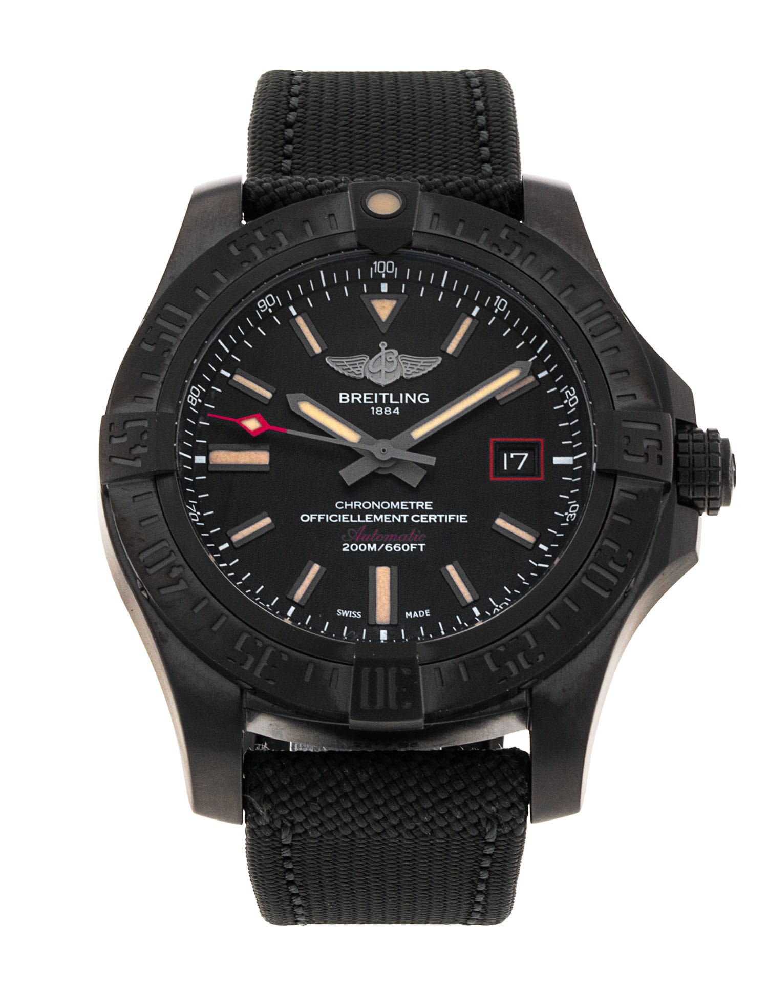 This Breitling Avenger Blackbird V17311 has a black baton dial and a fabric strap. This Breitling has undergone a thorough inspection of water resistance, accuracy, functionality and condition to determine the level of reconditioning required to meet our strict standards. It has also been referenced against technical documents and manufacturer records where available to ensure authenticity and a clean history. Our watches have a 24-month warranty for your peace of mind, in conjunction with any remaining manufacturer’s warranty from new or from service.